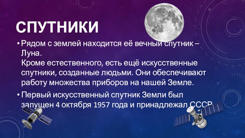 СпутникиРядом с землей находится её вечный спутник – Луна. Кроме естественного, есть ещё искусственные спутники, созданные людьми.
