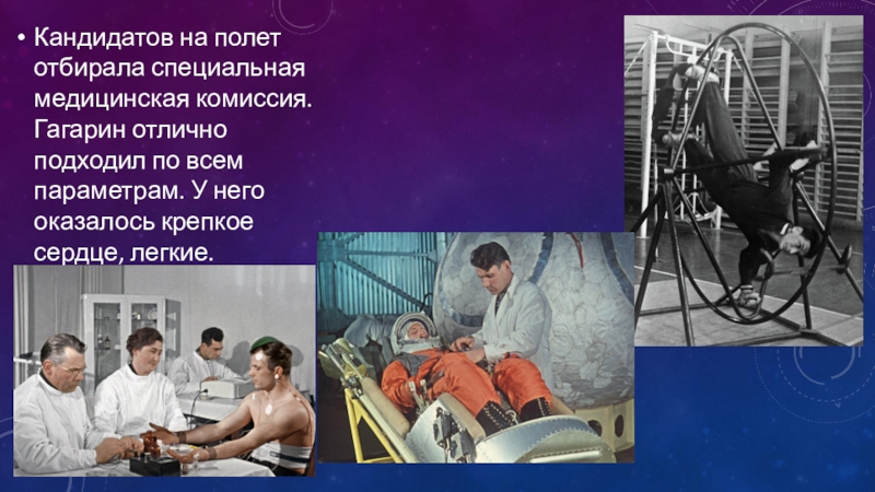 Слайд 8Кандидатов на полет отбирала специальная медицинская комиссия. Гагарин отлично подходил по