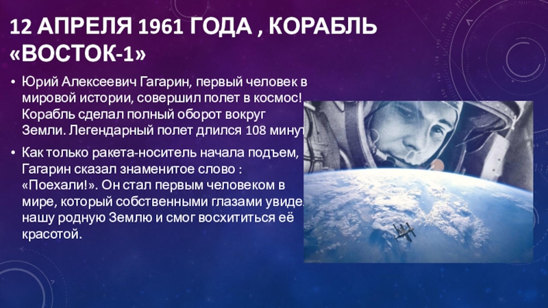 в мировой истории, совершил полет в космос! Корабль сделал полный оборот вокруг Земли. Легендарный полет длился 108 минут.