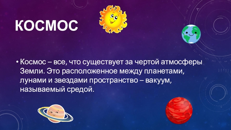 КосмосКосмос – все, что существует за чертой атмосферы Земли. Это расположенное между планетами, лунами и звездами пространство – вакуум, называемый средой.