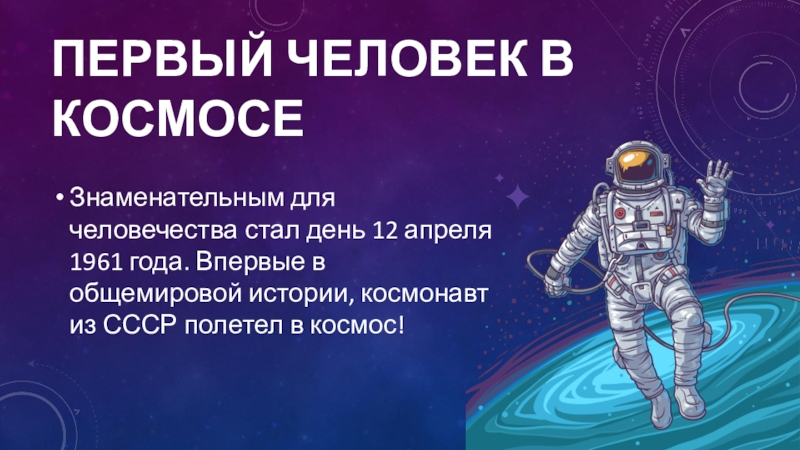 Первый человек в космосеЗнаменательным для человечества стал день 12 апреля 1961 года. Впервые в общемировой истории, космонавт