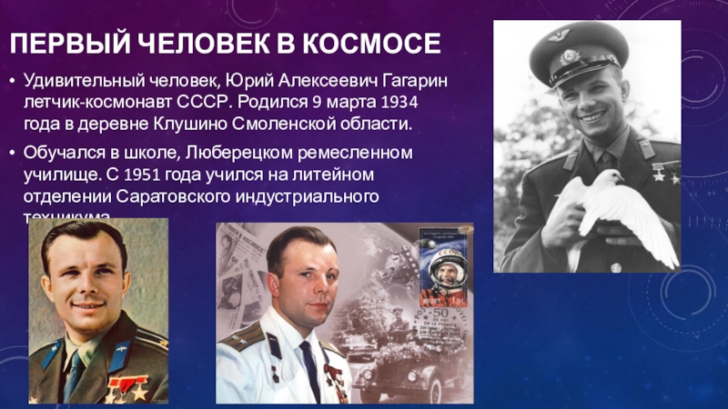 Первый человек в космосеУдивительный человек, Юрий Алексеевич Гагарин летчик-космонавт СССР. Родился 9 марта 1934 года в деревне