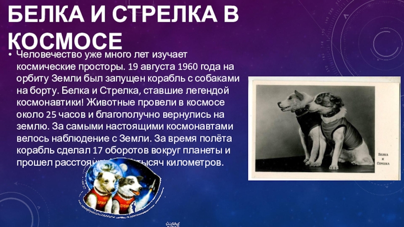 Белка и стрелка в космосеЧеловечество уже много лет изучает космические просторы. 19 августа 1960 года на орбиту