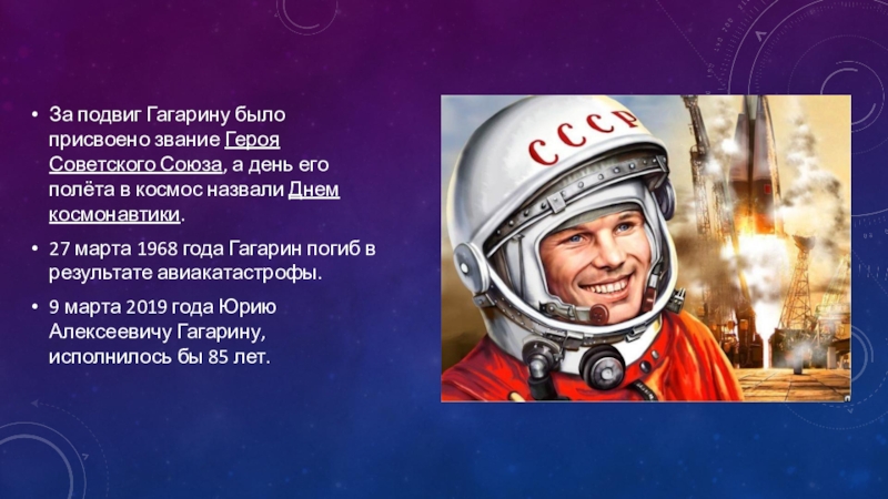 Слайд 11За подвиг Гагарину было присвоено звание Героя Советского Союза, а день