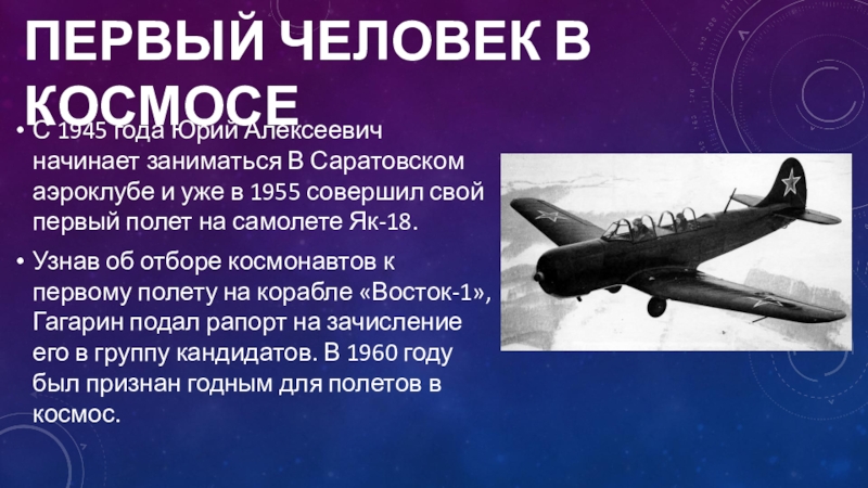 Первый человек в космосеС 1945 года Юрий Алексеевич начинает заниматься В Саратовском аэроклубе и уже в 1955