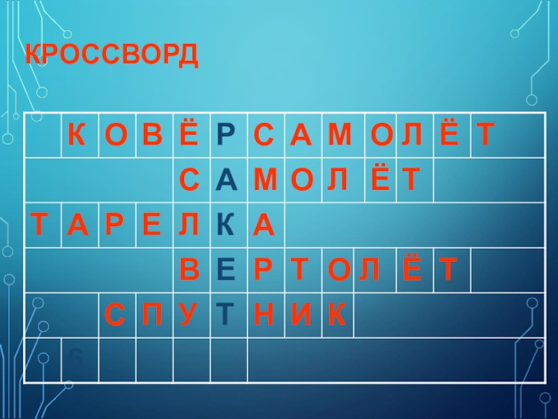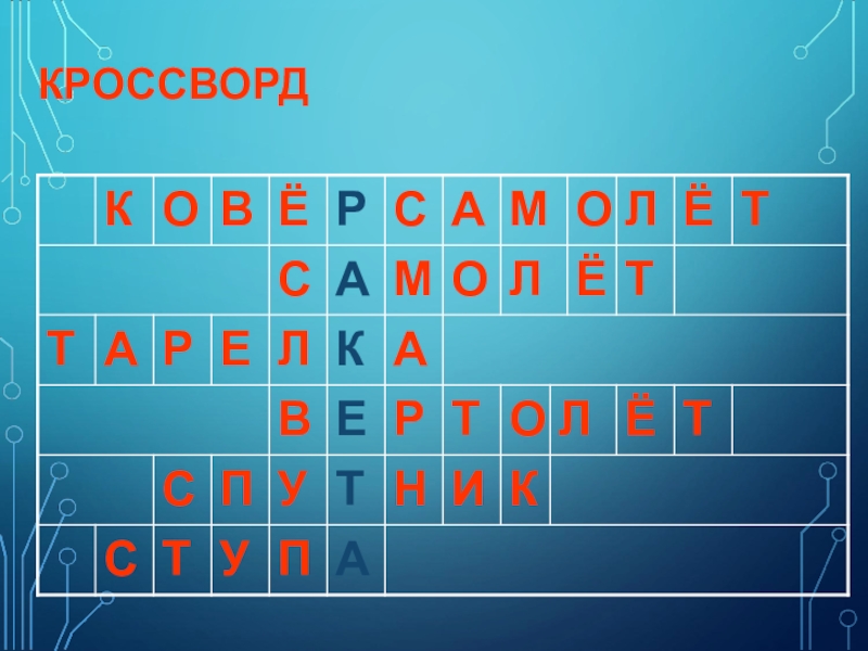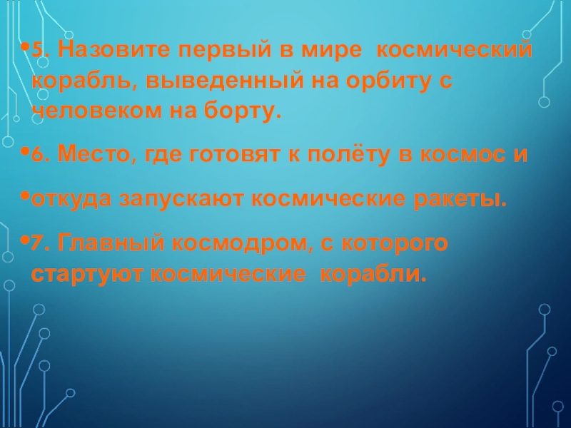 5. Назовите первый в мире космический корабль, выведенный на орбиту с человеком на борту.6. Место, где готовят