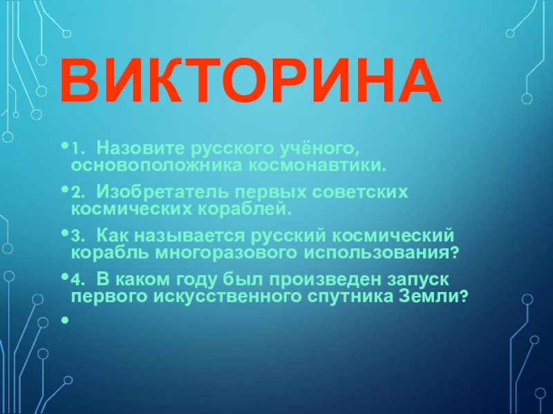 ВИКТОРИНА1. Назовите русского учёного, основоположника космонавтики.2. Изобретатель первых советских космических кораблей.3. Как называется русский космический корабль многоразового