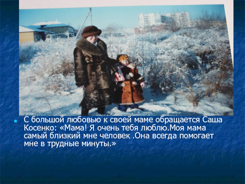 Слайд 8С большой любовью к своей маме обращается Саша Косенко: «Мама! Я