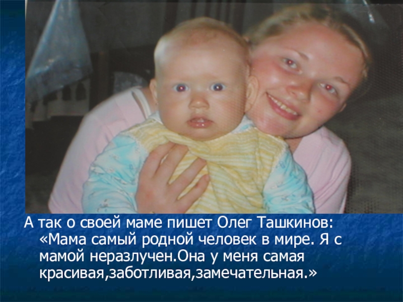 Слайд 12А так о своей маме пишет Олег Ташкинов: «Мама самый родной