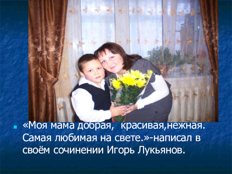 Слайд 4«Моя мама добрая, красивая,нежная.Самая любимая на свете.»-написал в своём сочинении Игорь