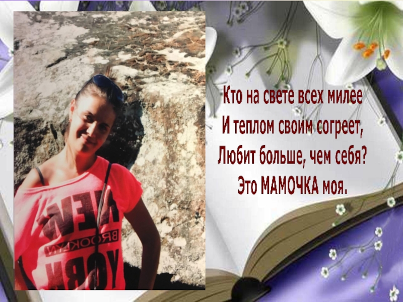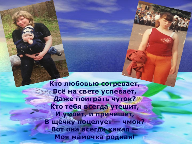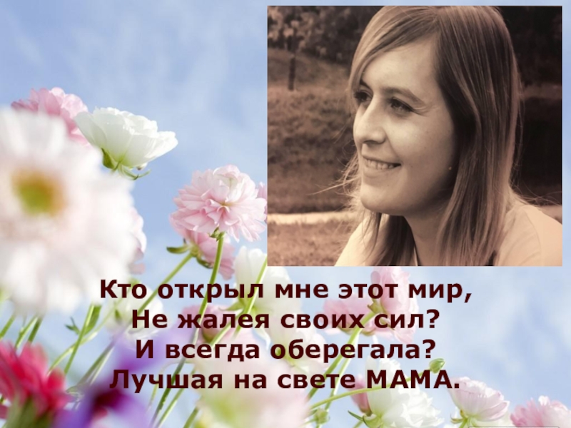 Кто открыл мне этот мир,Не жалея своих сил?И всегда оберегала?Лучшая на свете МАМА.