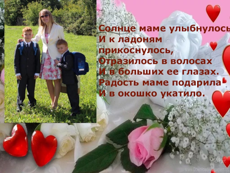 Солнце маме улыбнулосьИ к ладоням прикоснулось,Отразилось в волосахИ в больших ее глазах.Радость маме подарилаИ в окошко укатило.