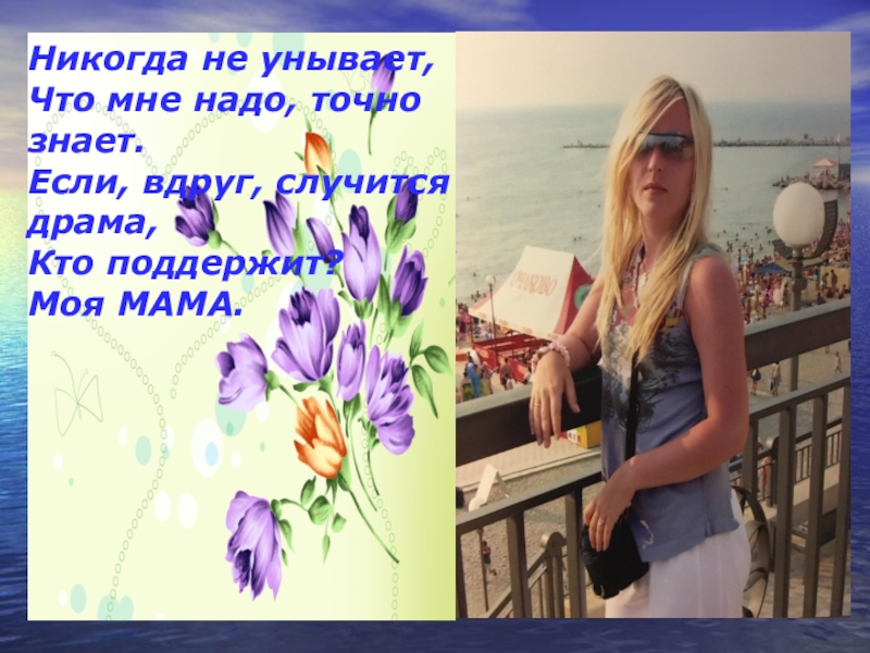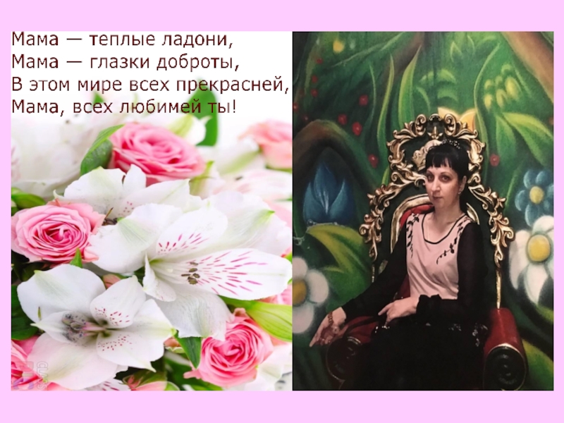 Слайд 4Красивые глаза у мамы, Улыбка теплая и взгляд лучистый, Всегда идет по жизни