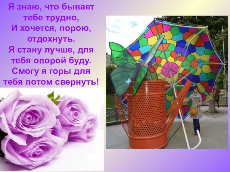 Я знаю, что бывает тебе трудно,И хочется, порою, отдохнуть.Я стану лучше, для тебя опорой буду.Смогу я горы