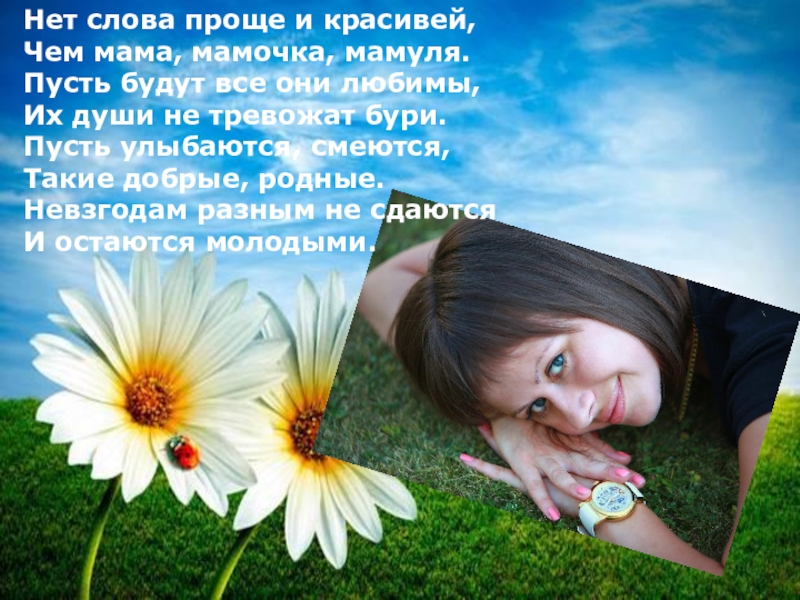 Нет слова проще и красивей,Чем мама, мамочка, мамуля.Пусть будут все они любимы,Их души не тревожат бури.Пусть улыбаются,