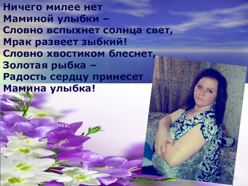Ничего милее нетМаминой улыбки –Словно вспыхнет солнца свет,Мрак развеет зыбкий!Словно хвостиком блеснет,Золотая рыбка –Радость сердцу принесетМамина улыбка!