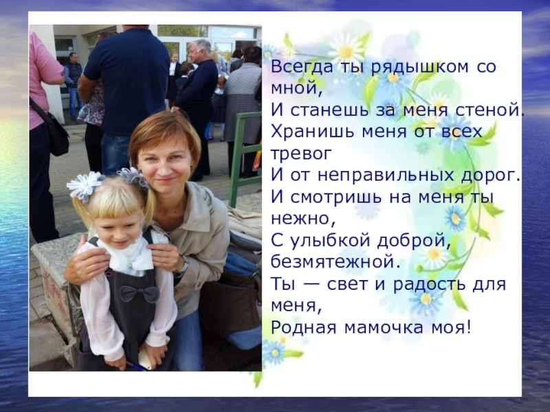 Всегда ты рядышком со мной,И станешь за меня стеной.Хранишь меня от всех тревогИ от неправильных дорог.И смотришь