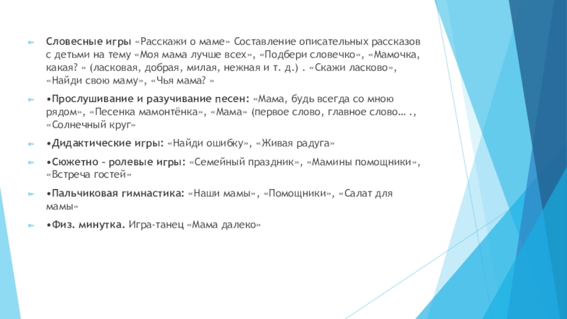 Слайд 12Словесные игры «Расскажи о маме» Составление описательных рассказов с детьми на тему