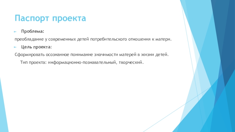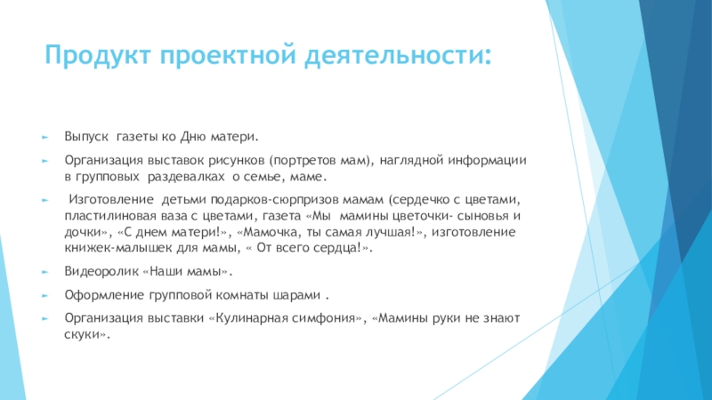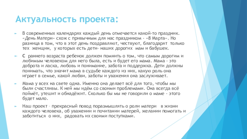Наш проект – прекрасный повод поразмышлять о роли матери в жизни каждого человека, об уважении и почитании матерей, желании помогать и заботиться о них, радовать их своими поступками.