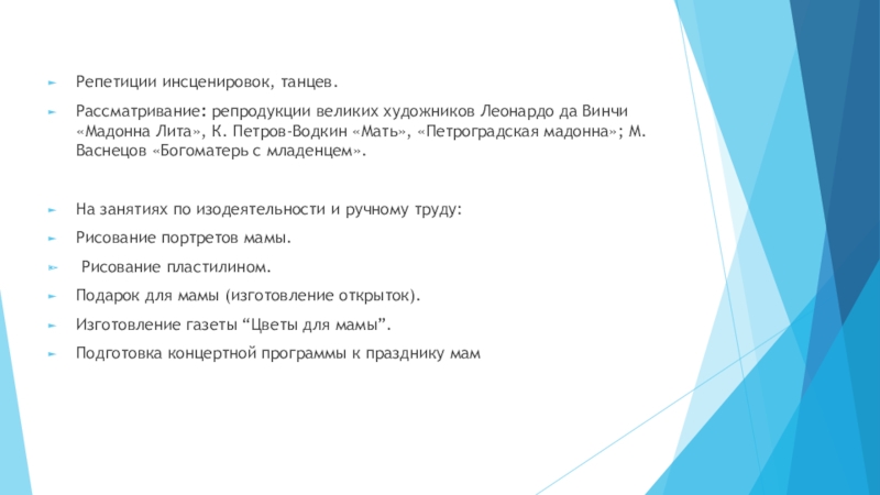 НОД «Наша любимая мама» и др. «Знакомство с историей возникновения праздника», «Чем можно порадовать маму», «Почему мама поздно ложится спать», «Мамин праздник», «Чудо материнской любви»; Беседы - обсуждения бытовых ситуаций на тему: «Почему мама грустит?», «Чем я порадовал маму?», «Как сказать о том, что я натворил?», «Я поступаю хорошо»