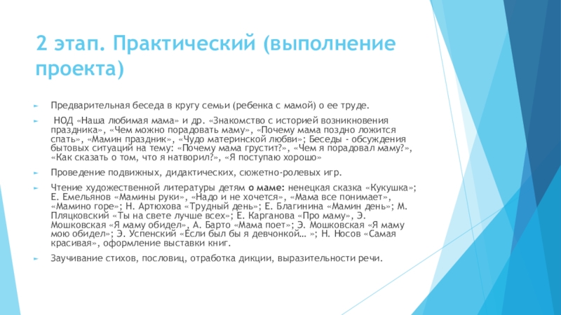 Чтение художественной литературы детям о маме: ненецкая сказка «Кукушка»; Е. Емельянов «Мамины руки», «Надо и не хочется», «Мама все понимает», «Мамино горе»; Н. Артюхова «Трудный день»; Е. Благинина «Мамин день»; М. Пляцковский «Ты на свете лучше всех»; Е. Карганова «Про маму», Э. Мошковская «Я маму обидел», А. Барто «Мама поет»; Э. Мошковская «Я маму мою обидел»; Э. Успенский «Если был бы я девчонкой… »; Н. Носов «Самая красивая», оформление выставки книг.