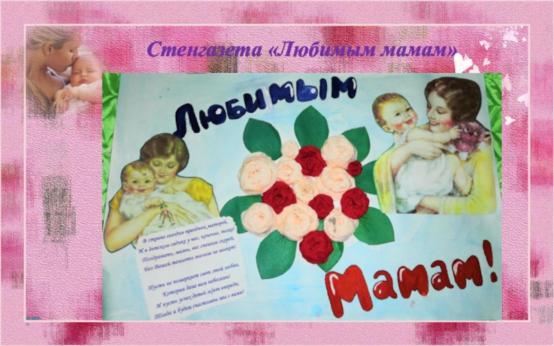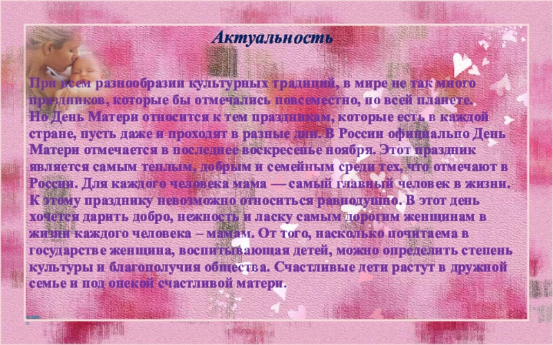 праздников, которые бы отмечались повсеместно, по всей планете. Но День Матери относится к тем праздникам, которые есть в каждой стране, пусть даже и проходят в разные дни. В России официально День Матери отмечается в последнее воскресенье ноября. Этот праздник является самым теплым, добрым и семейным среди тех, что отмечают в России. Для каждого человека мама — самый главный человек в жизни. К этому празднику невозможно относиться равнодушно. В этот день хочется дарить добро, нежность и ласку самым дорогим женщинам в жизни каждого человека – мамам. От того, насколько почитаема в государстве женщина, воспитывающая детей, можно определить степень культуры и благополучия общества. Счастливые дети растут в дружной семье и под опекой счастливой матери.