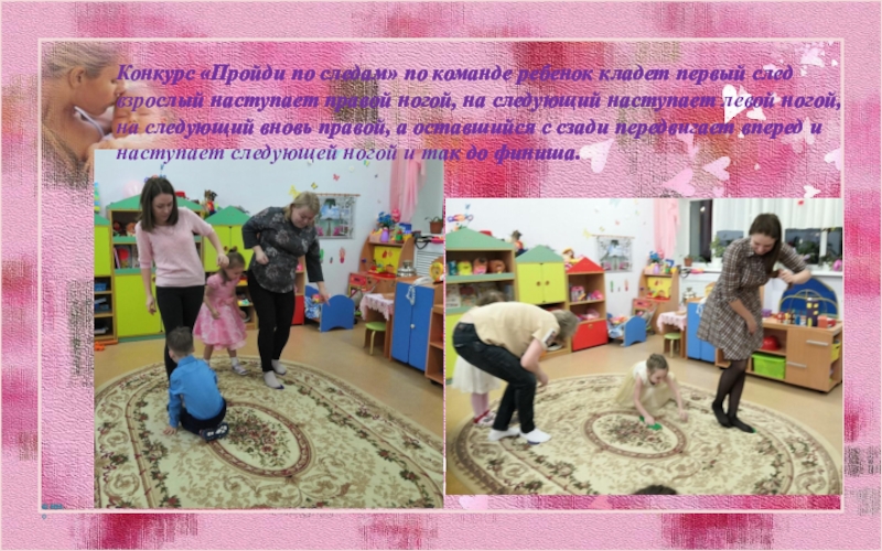 Слайд 16Конкурс «Пройди по следам» по команде ребенок кладет первый след взрослый