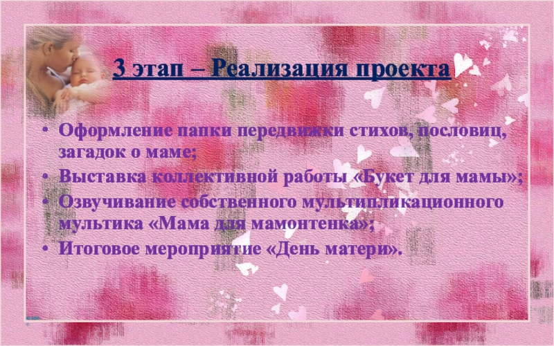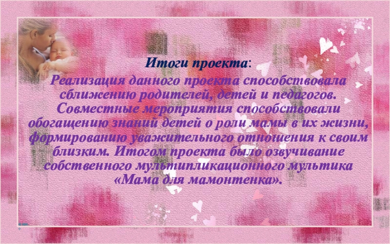 мероприятия способствовали обогащению знаний детей о роли мамы в их жизни, формированию уважительного отношения к своим близким. Итогом проекта было озвучивание собственного мультипликационного мультика «Мама для мамонтенка».