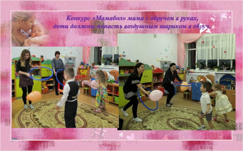 Слайд 15Конкурс «Мамабол» мама с обручем в руках,