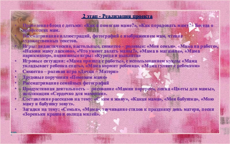 Игры: дидактические, настольные, сюжетно – ролевые: «Моя семья», «Мама на работе», «Назови маму ласково», «Что умеют делать мамы?», «Мама в магазине», «Мама парикмахер», подвижные игры: «Курица и цыплята»