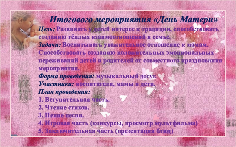 Задачи: Воспитывать уважительное отношение к мамам. Способствовать созданию положительных эмоциональных переживаний детей и родителей от совместного празднования мероприятия.