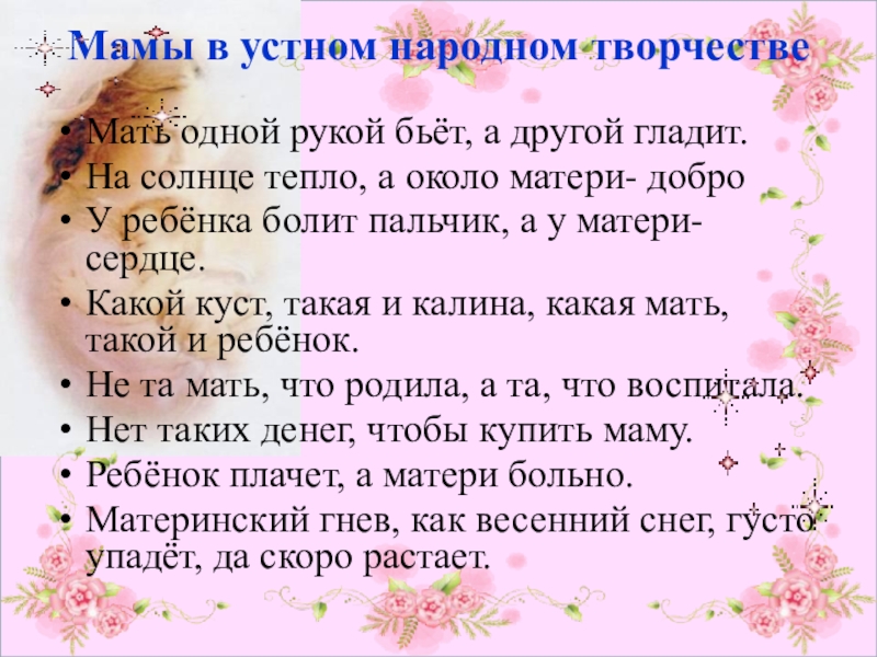 душой их любят дети. Только мама есть одна, Всех дороже мне она.