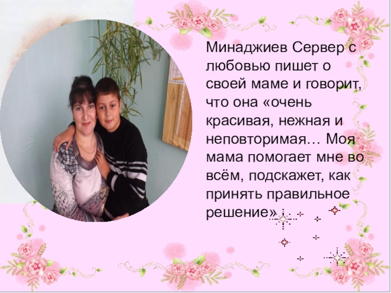 она «очень красивая, нежная и неповторимая… Моя мама помогает мне во всём, подскажет, как принять правильное решение»