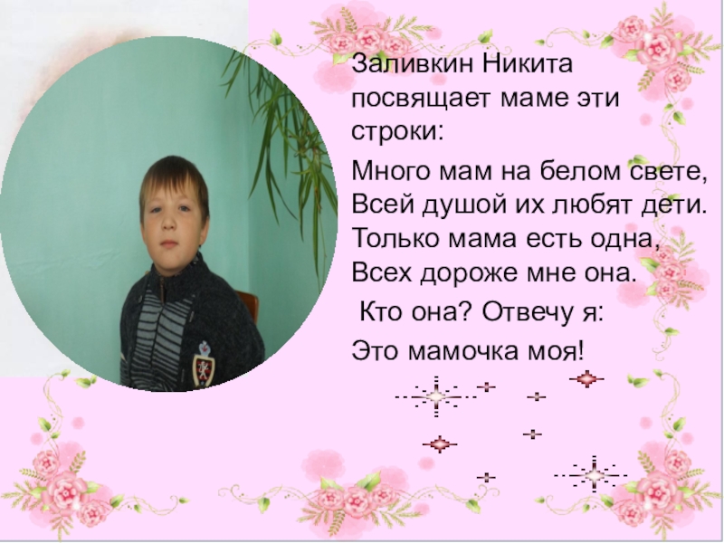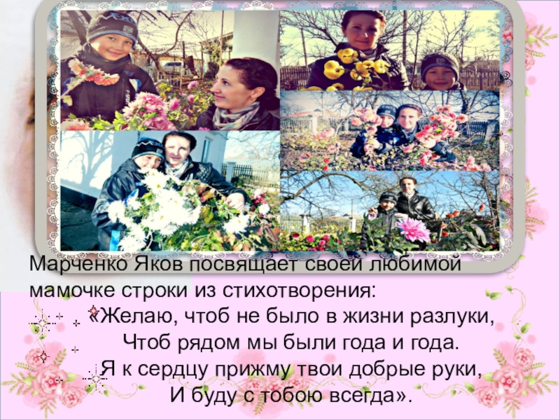 Марченко Яков посвящает своей любимой мамочке строки из стихотворения: