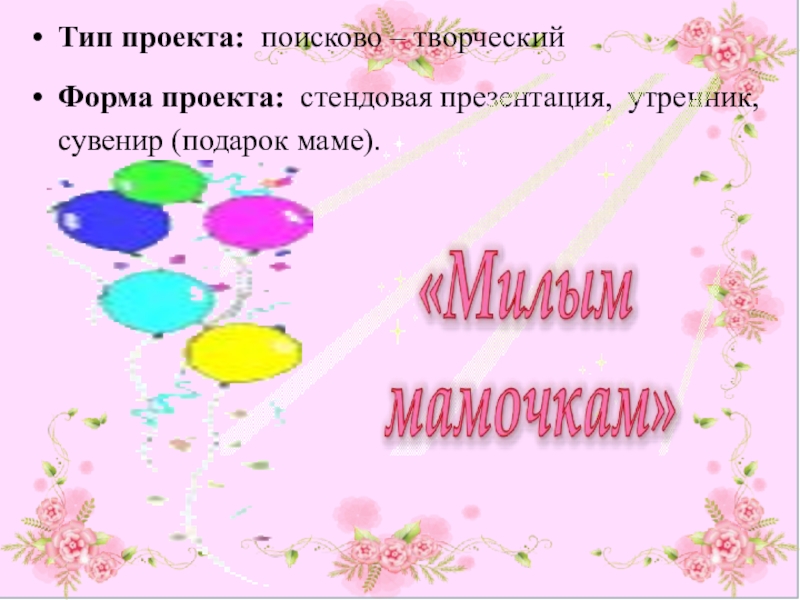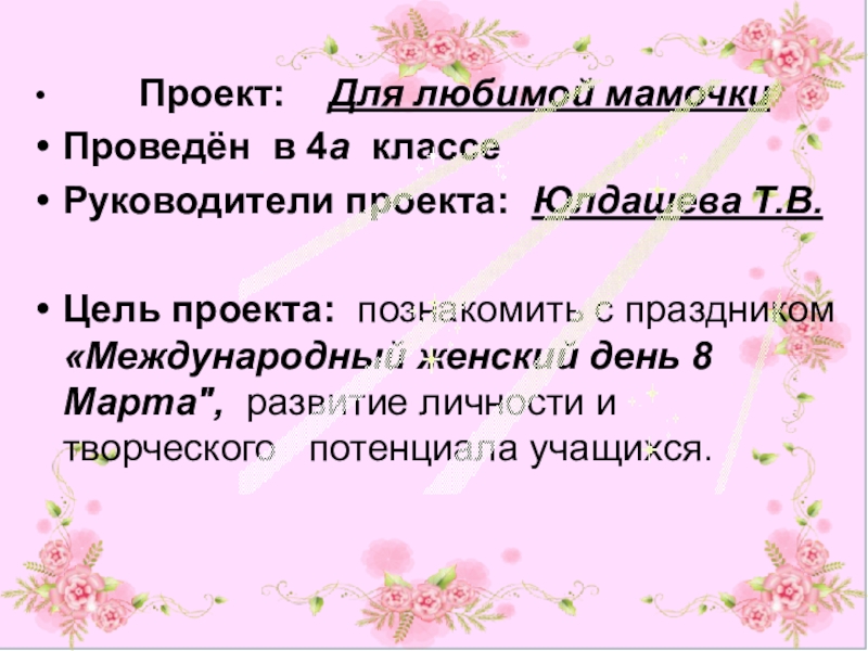 Цель проекта: познакомить с праздником «Международный женский день 8 Марта", развитие личности и творческого потенциала учащихся.