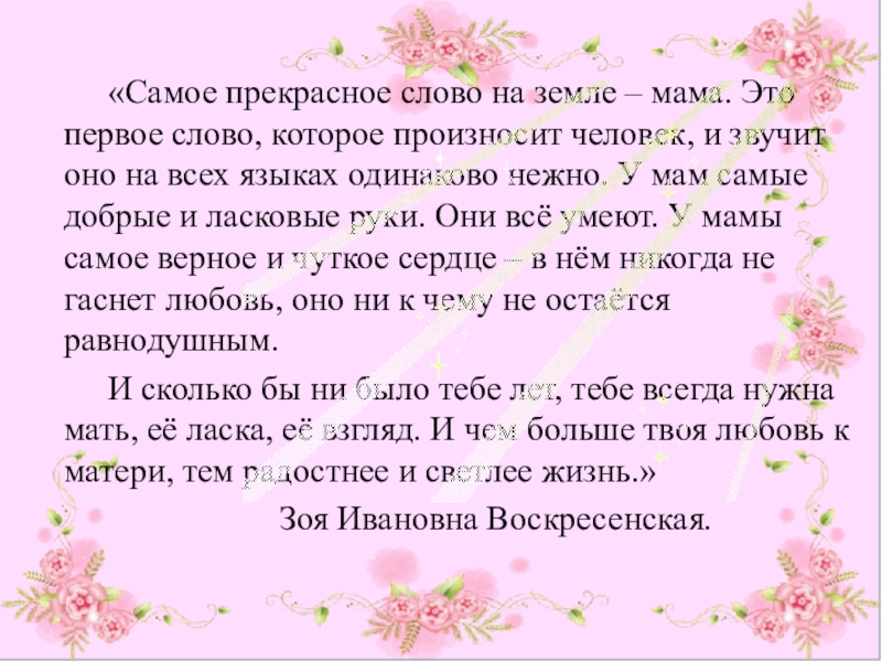 мама. Это первое слово, которое произносит человек, и звучит оно на всех языках одинаково нежно. У мам самые добрые и ласковые руки. Они всё умеют. У мамы самое верное и чуткое сердце – в нём никогда не гаснет любовь, оно ни к чему не остаётся равнодушным.