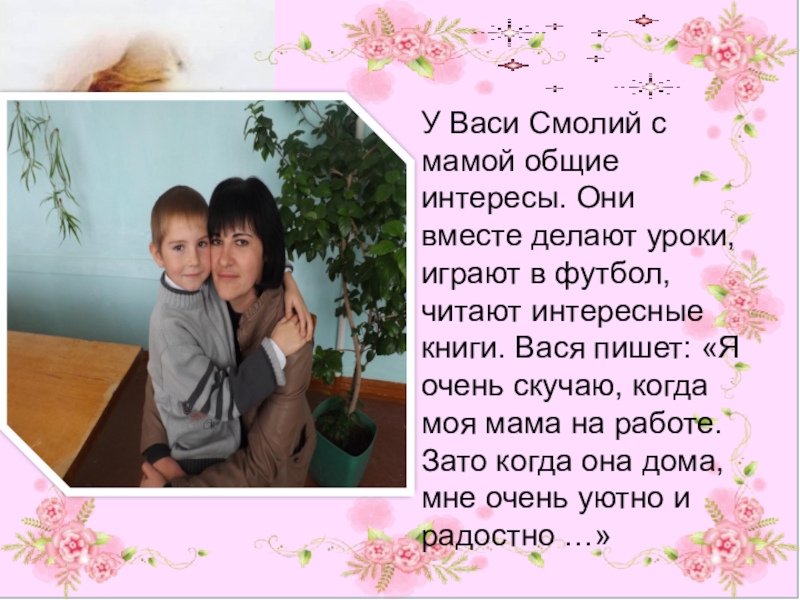 играют в футбол, читают интересные книги. Вася пишет: «Я очень скучаю, когда моя мама на работе. Зато когда она дома, мне очень уютно и радостно …»