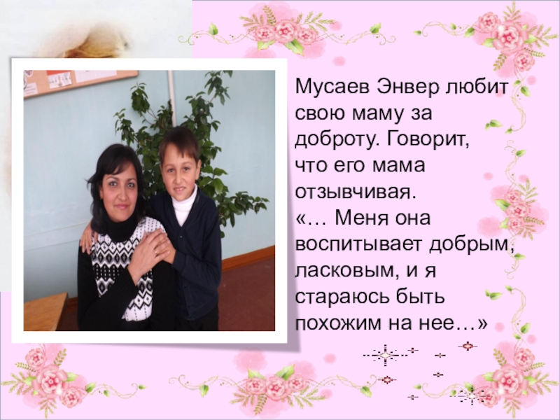 Мусаев Энвер любит свою маму за доброту. Говорит,
