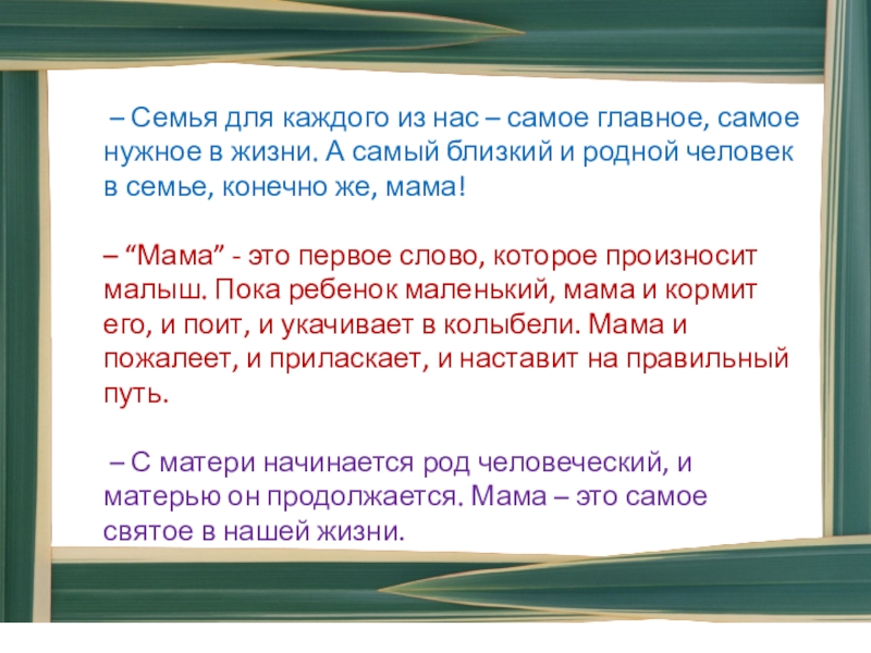 – “Мама” - это первое слово, которое произносит малыш. Пока ребенок маленький, мама и кормит его, и поит, и укачивает в колыбели. Мама и пожалеет, и приласкает, и наставит на правильный путь.