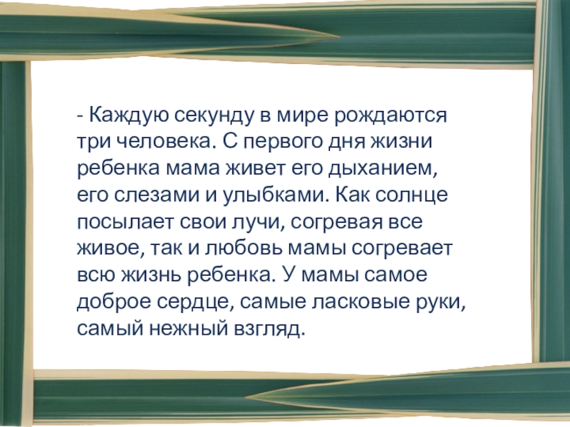 - Каждую секунду в мире рождаются три человека. С первого дня жизни ребенка мама живет его дыханием,