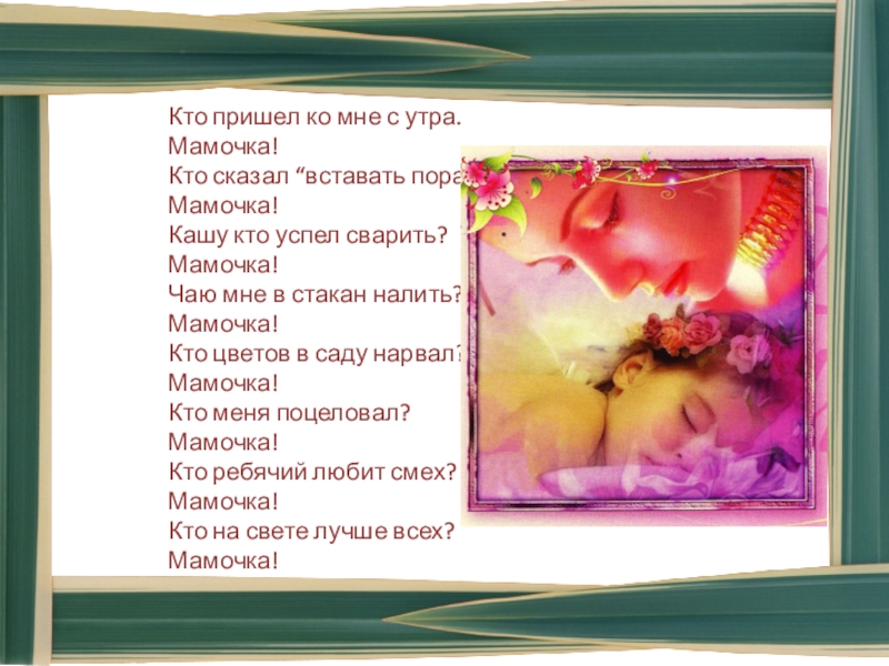 Слайд 6Кто пришел ко мне с утра. Мамочка! Кто сказал “вставать пора”! Мамочка! Кашу кто успел