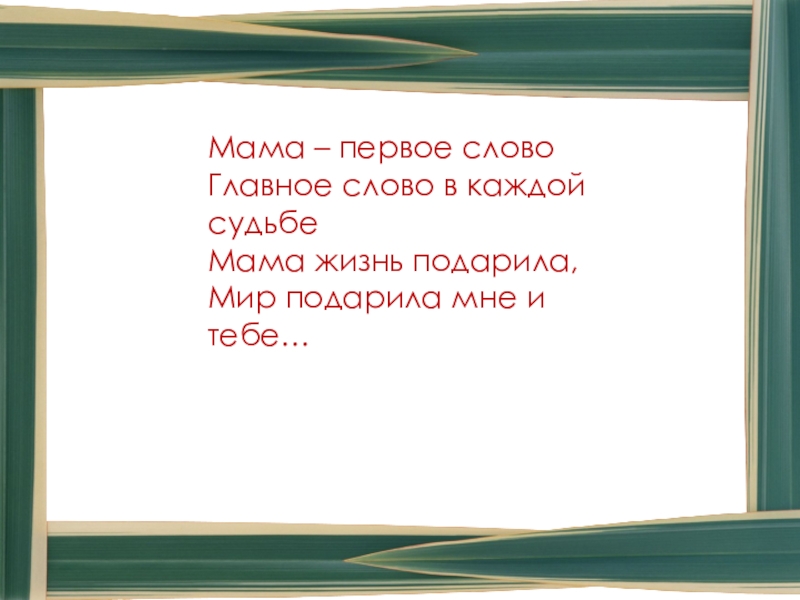Слайд 4Мама – первое слово Главное слово в каждой судьбе Мама жизнь подарила, Мир подарила