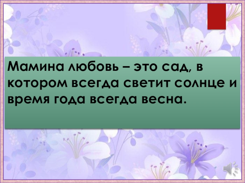 Слайд 40Мамина любовь – это сад, в котором всегда светит солнце и