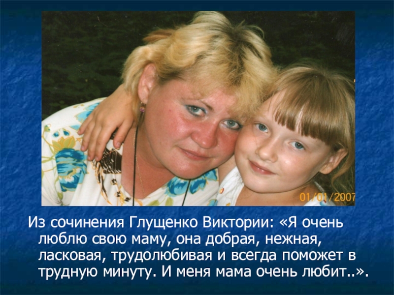 Слайд 21 Из сочинения Глущенко Виктории: «Я очень люблю свою маму, она