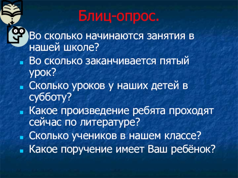 Блиц-опрос.Во сколько начинаются занятия в нашей школе?Во сколько заканчивается пятый урок?Сколько уроков у наших детей в субботу?Какое