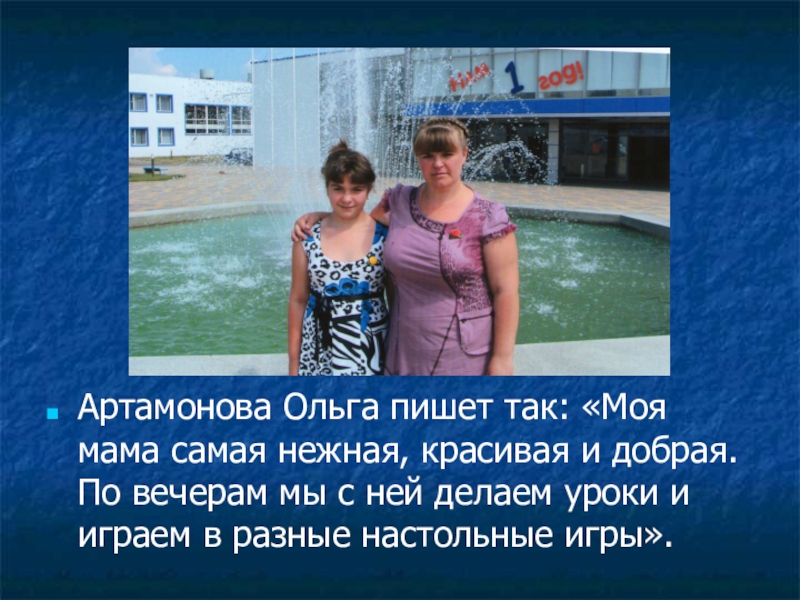 Артамонова Ольга пишет так: «Моя мама самая нежная, красивая и добрая. По вечерам мы с ней делаем