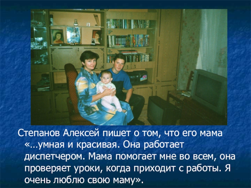 Слайд 22 Степанов Алексей пишет о том, что его мама «…умная и