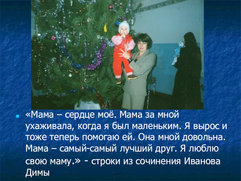маленьким. Я вырос и тоже теперь помогаю ей. Она мной довольна. Мама – самый-самый лучший друг. Я люблю свою маму.» - строки из сочинения Иванова Димы
