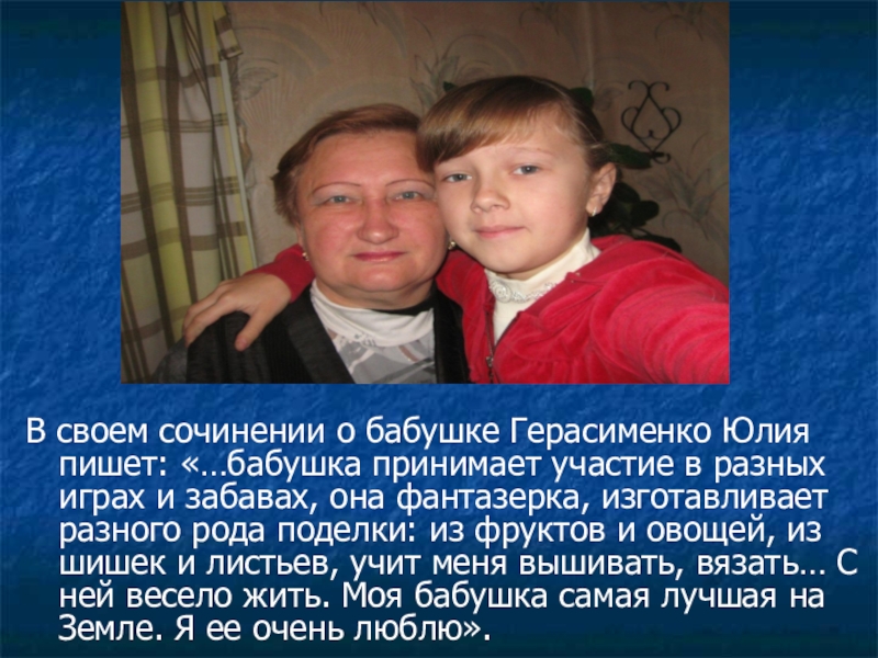 Слайд 20В своем сочинении о бабушке Герасименко Юлия пишет: «…бабушка принимает участие