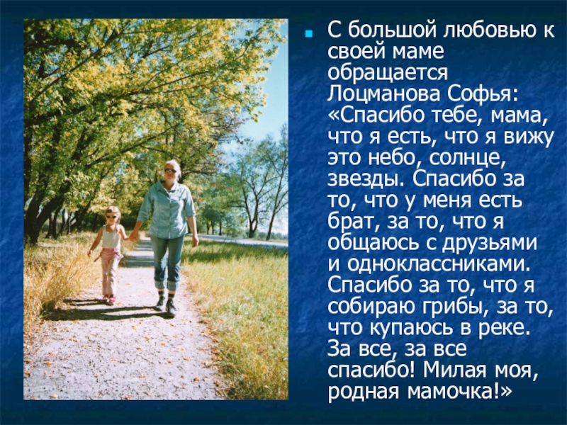 Слайд 9С большой любовью к своей маме обращается Лоцманова Софья: «Спасибо тебе,